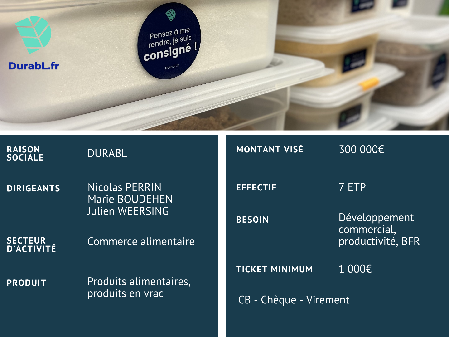 Fondée en 2021 à Rennes, la société a pivoté rapidement vers un modèle exclusivement BtoB avant d'être reprise en 2024 par une nouvelle équipe dirigeante qui a relancé et accéléré son développement. DurabL détient le statut ESUS et s'appuie sur un partenariat logistique stratégique avec La Poste / Log'issimo pour couvrir l'ensemble du Grand Ouest en J+1.